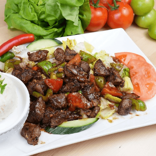 Shaking beef with bell pepper, yellow onion, and vegetables. Shaking beef serve with 1 bowl of rice.