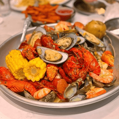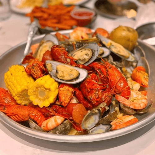 1 lb of king crab legs, 1 whole Dungeness crab, 2 lobster tails or 1 Maine lobster (seasonal) Pick 1: shrimp, crawfish, clams or mussels, 2 corns, 2 potatoes, 10 sausages
