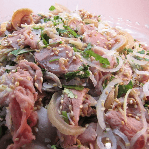 Beef tendon salad includes carrot, daikon, onion, and herbs.