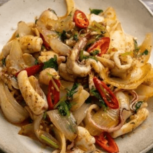 Sauteed squid with spicy chili sauce.