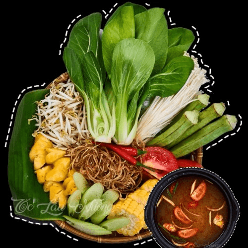 Snails hotpot includes vegetables, broth, vermicelli, clams, whelks, mussels, and fish cake.