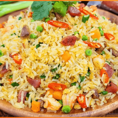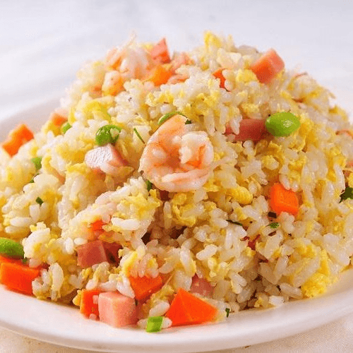 A perfect balance and well seasoned wok fried rice with shrimp, carrot, pea, Asian sausage, egg, and green onion.