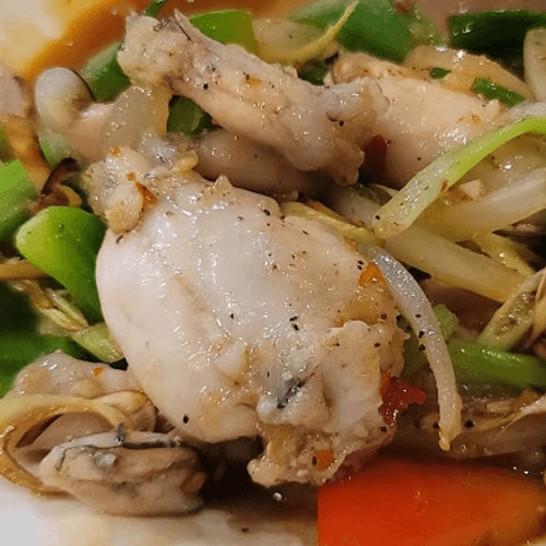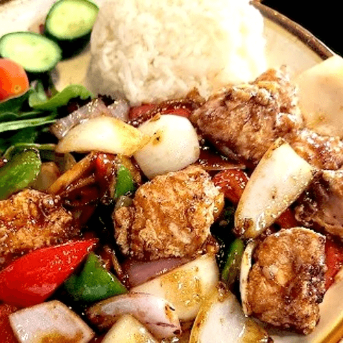 Fried cube salmon stir-fried with house special sauce served with rice and vegetables.