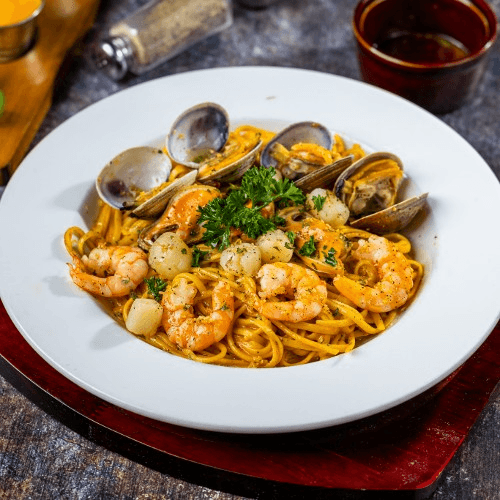 Linguine tossed in lobster creamy sauce and topped with shrimp, scallops, clams and mussels