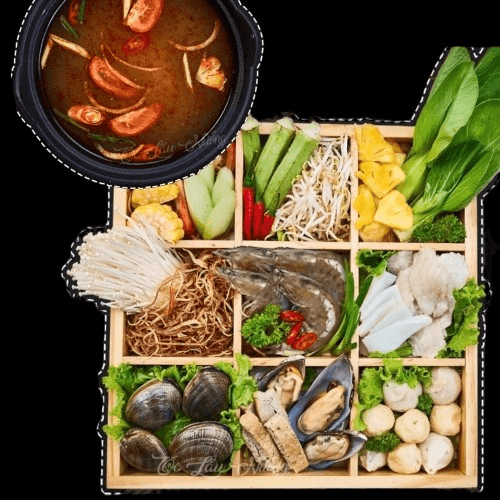 The seafood hotpot comes with vegetables, broth, vermicelli, clams, mussels, shrimps, fish balls, fishball with roe, and fish cake.