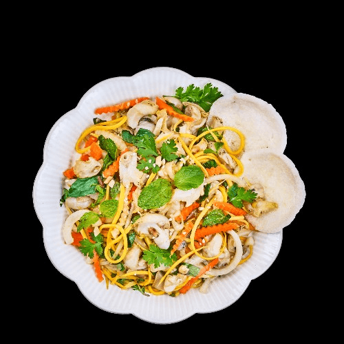 Conch salad includes carrot, daikon, onion, conch meat, banana flowers, and herbs.
