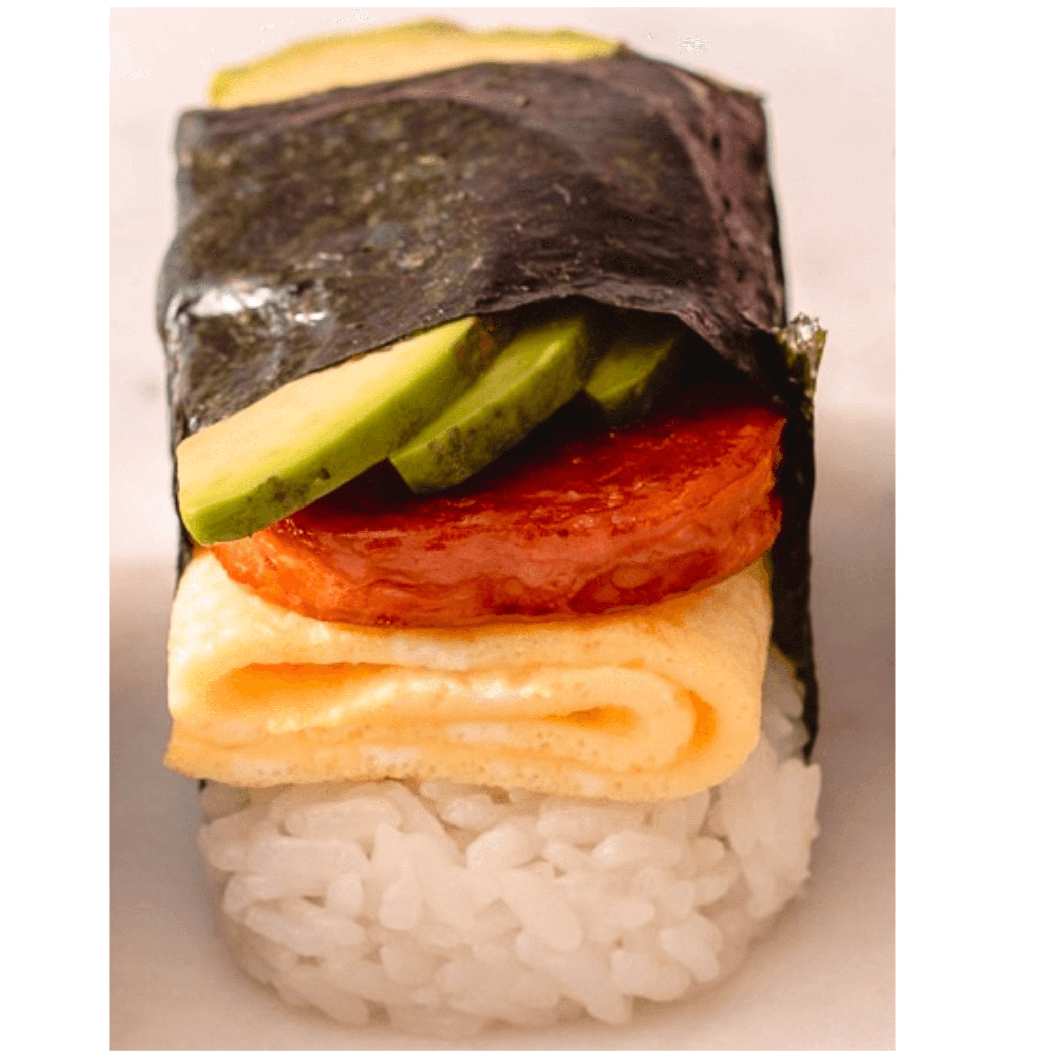 Rice, Spam, egg, and avacado.