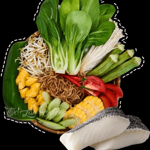 Chilean Seabass hotpot has vegetables, broth, vermicelli, and seabass filets.