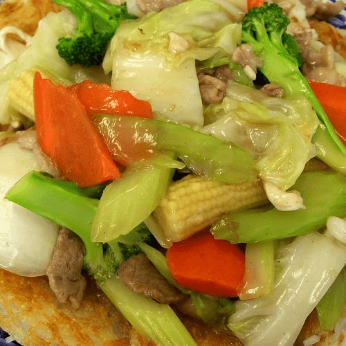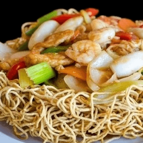 Crispy Fried Egg Noodle with Choice of Seafood or Beef & Vegetables.