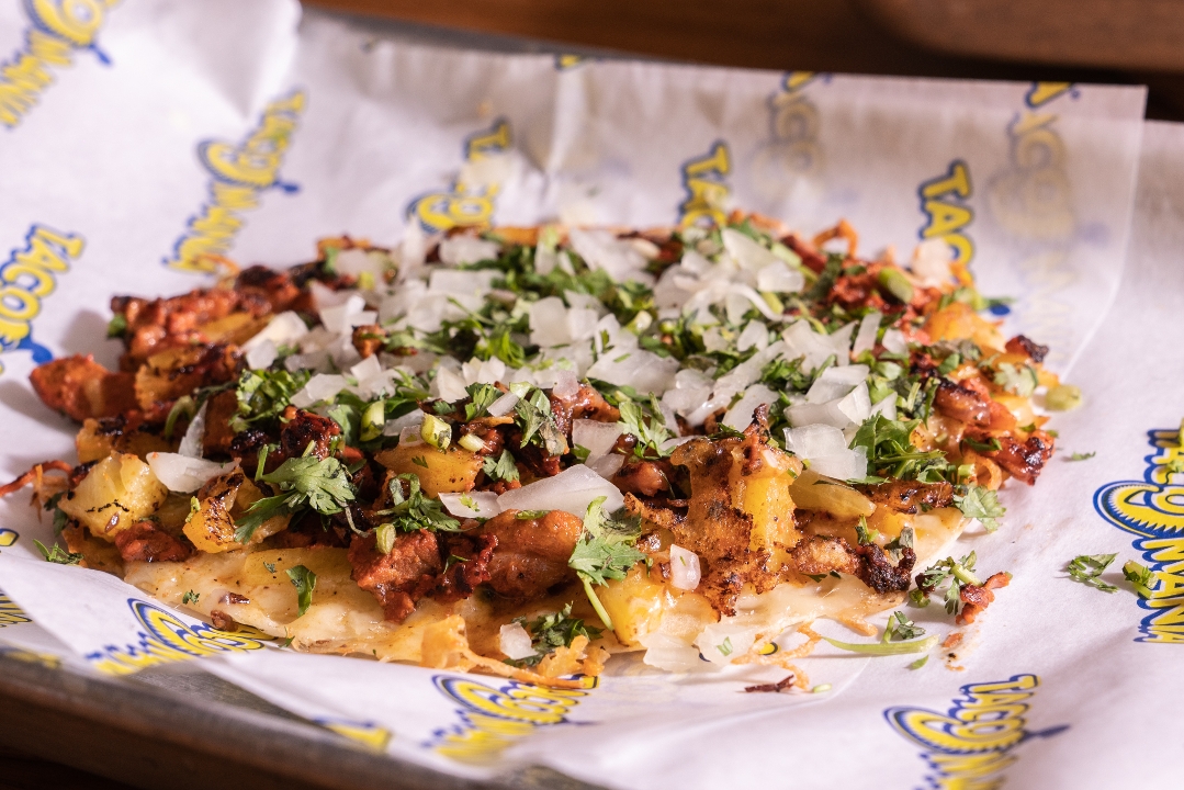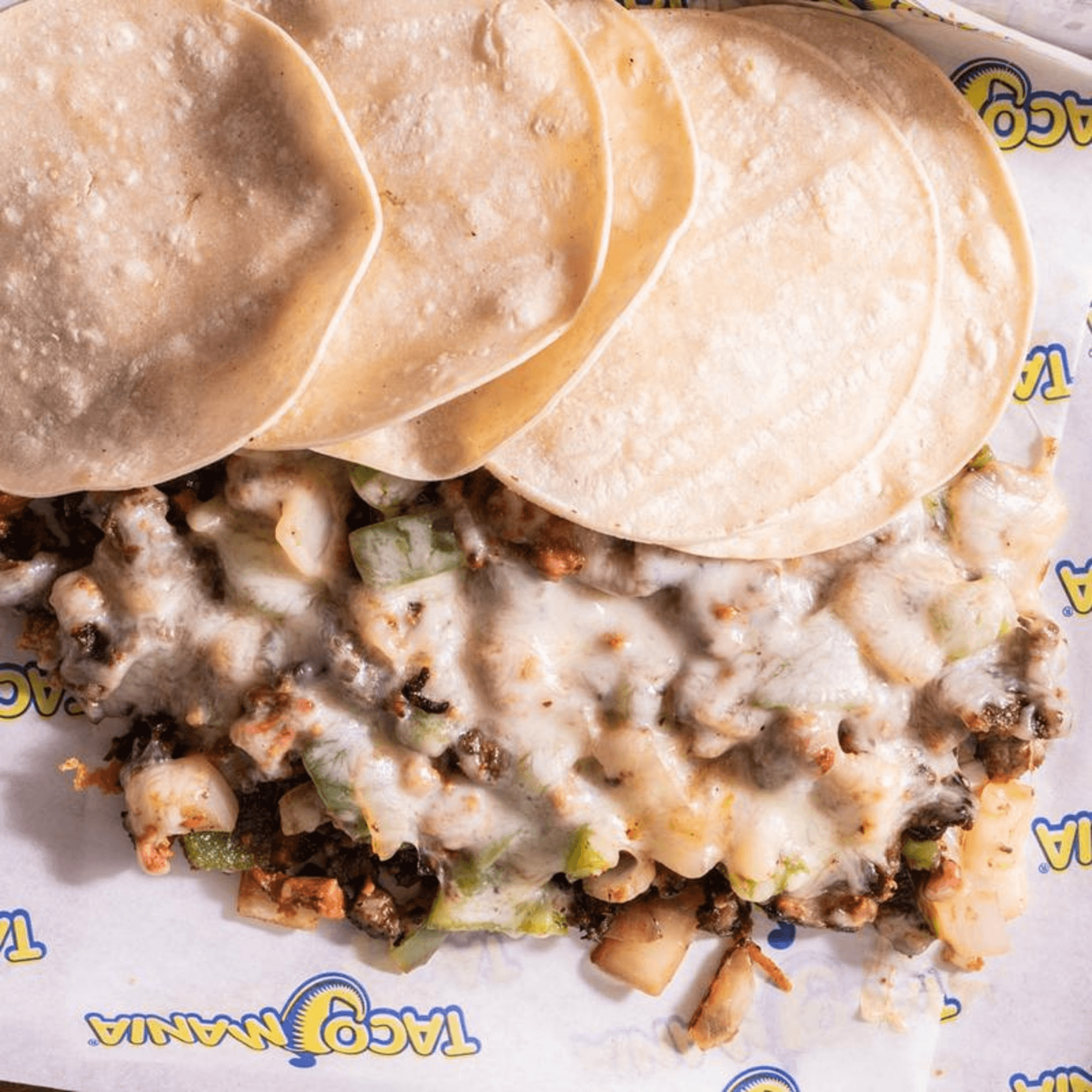 Asada, al pastor, chorizo, mixed with grilled onions, bell peppers, and cheese.