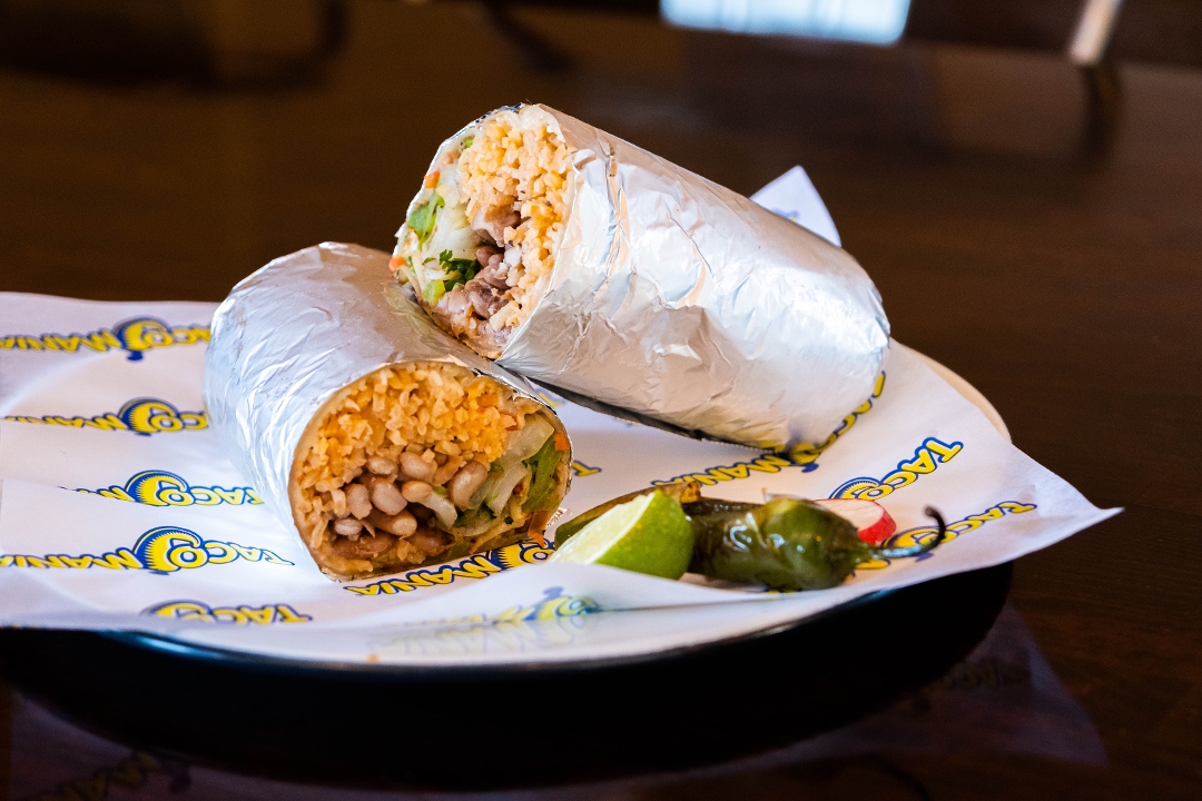 Choice of meat, onions, cilantro, cheese, rice, and beans.