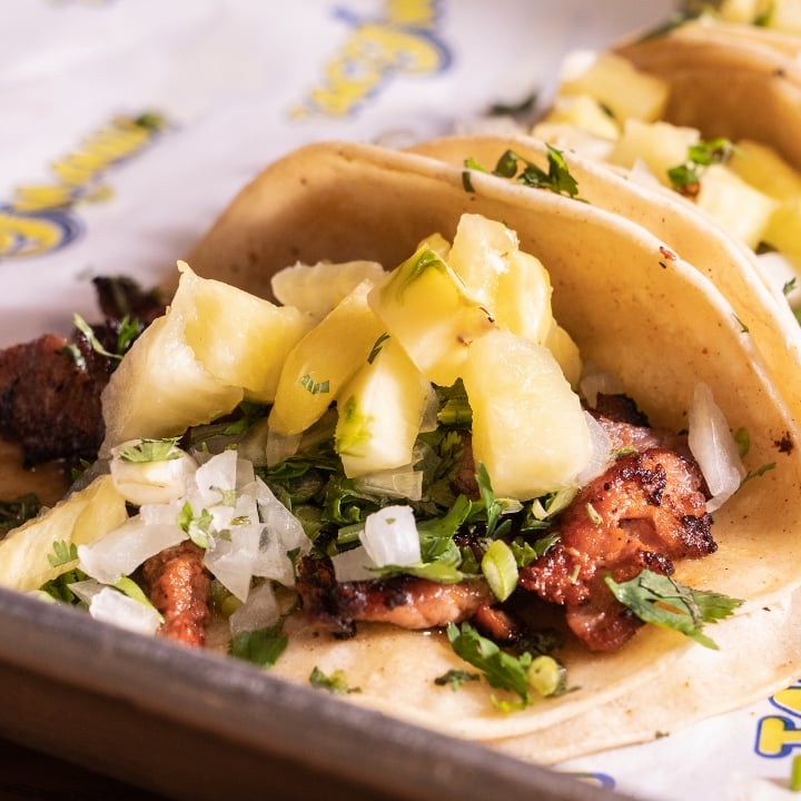 Regular flour tortilla, onions, cilantro, pineapple and al pastor meat.