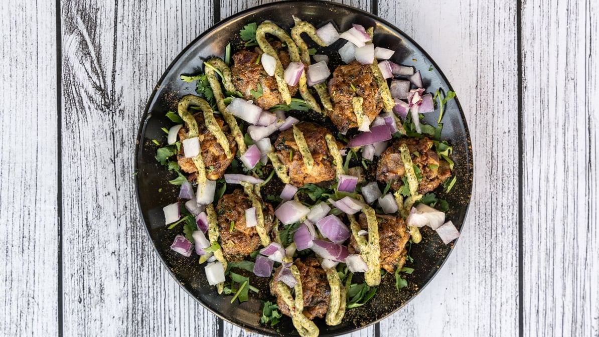 Spicy ground lamb marinated in kebab spices topped with red onions, mint chutney, fresh lemon & cilantro.