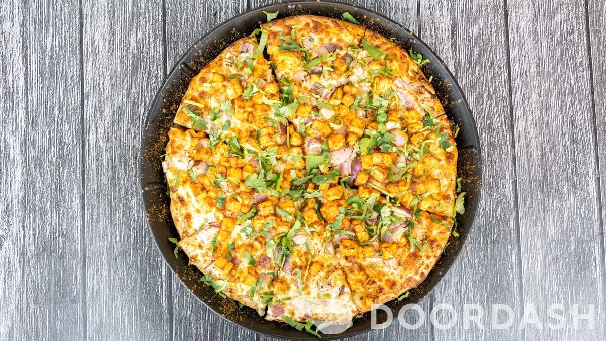 Spicy seasoned paneer, red onions, bell peppers, fresh cilantro with mozzarella cheese and creamy curry sauce.